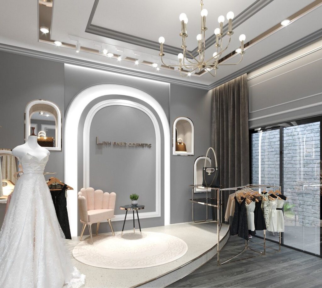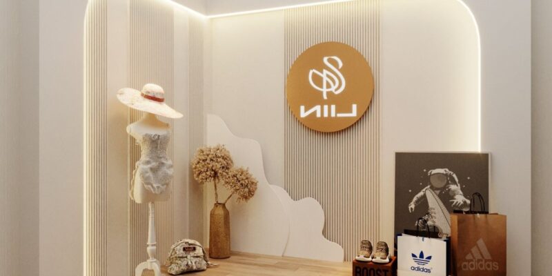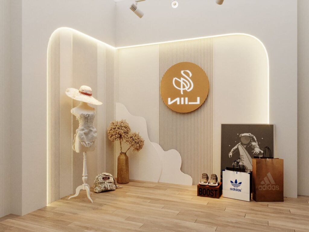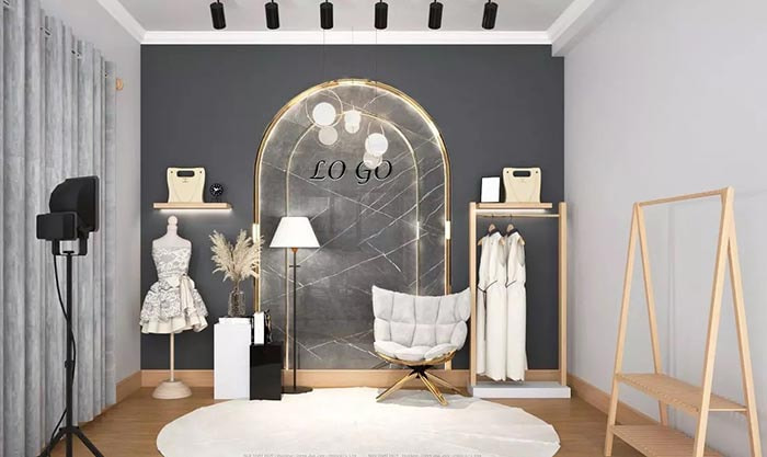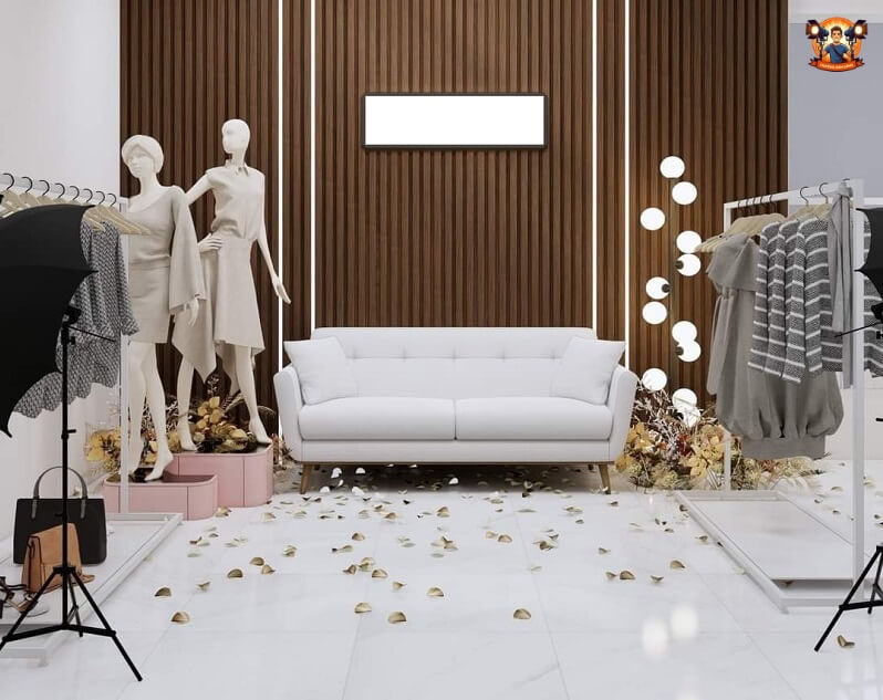 - Background: Sử dụng phông nền màu trắng hoặc các tone màu trung tính như xám hoặc beige, kết hợp với các giá treo quần áo, kệ trưng bày giày dép, phụ kiện thời trang.