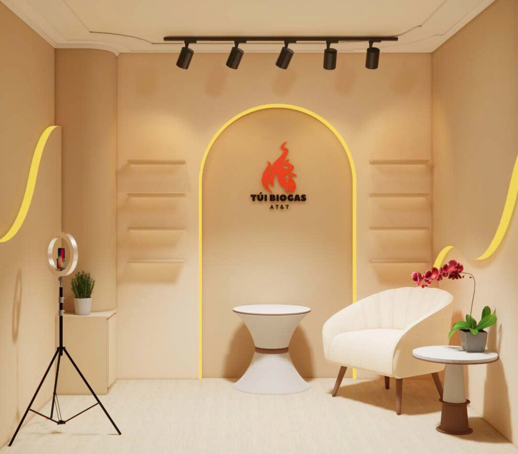 - Kệ trưng bày sản phẩm: Tích hợp kệ decor vừa là phông nền, vừa là nơi trưng bày các sản phẩm liên quan một cách khéo léo.